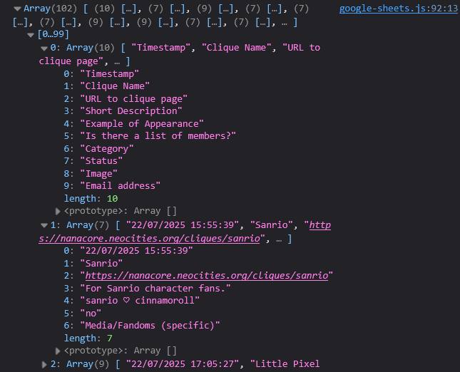 Once you call the function (fetchGoogleSheetData();) you should already see your data (as an array of arrays) in the console! Every array element represents one row, and each element is again an array, with each element in that array representing the content of each column.