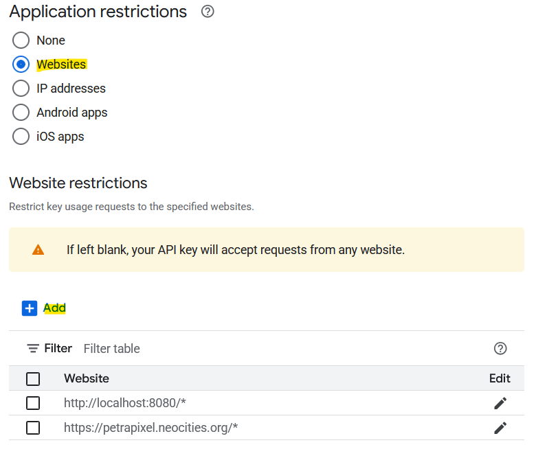 Anyone who knows the key will be able to use it. Since we will be using the key in a JavaScript file, anyone who inspects the code of your website will be able to view your key and therefore use it! If you think nobody will do that, you don't have to do anything. Since we will only be using the key to READ data and not WRITE data, it's really not that terrible if someone does use your key. But if you want to prevent it anyways, you will need to do the following steps:
