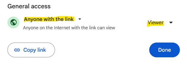 Now, publish your file to be read-only for anyone who has the link. (Your Google Sheets Document -> Share -> General access -> Anyone with the link: Viewer)