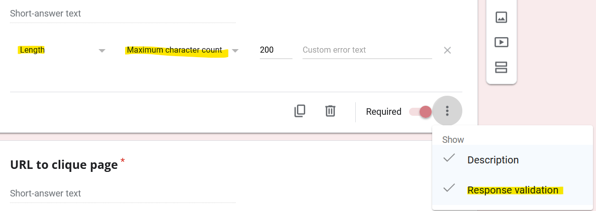 If you do this, people will be able to add data to your website by filling out the form - without you having moderated the responses first! Therefore, make sure you have proper response validation in place (Your Google Form -> Your Question -> Menu (Button on bottom right) -> Response Validation) (I recommend at least a maximum length) and check your data in the JS code.